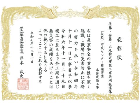 厚労省労働基準局長無災害表彰を受賞しました((仮称)市民センター整備事業 本体建築工事)