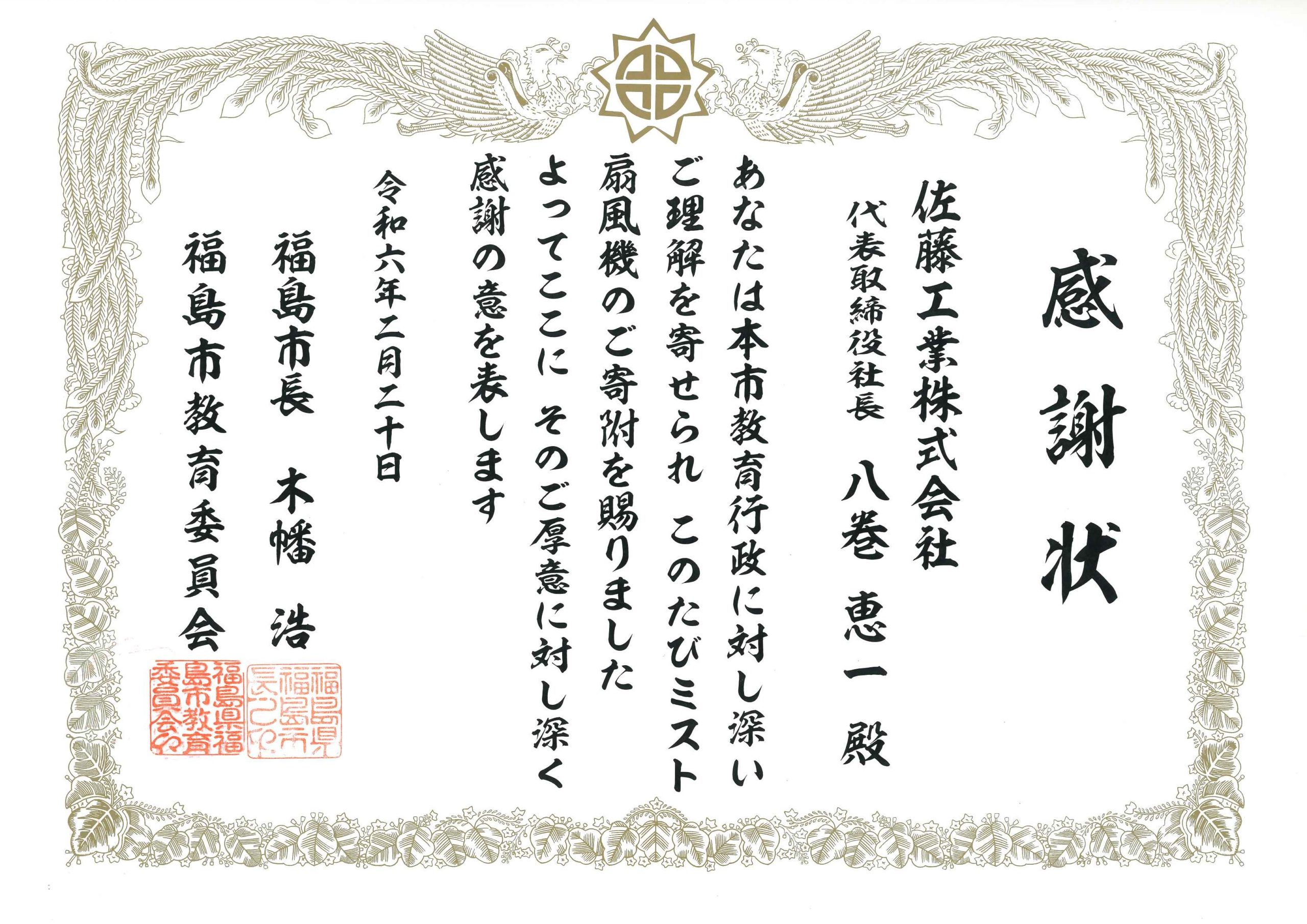 また、今回のミスト扇風機の寄付について2024年2月20日に福島市長及び福島市教育委員会より感謝状を頂きました。