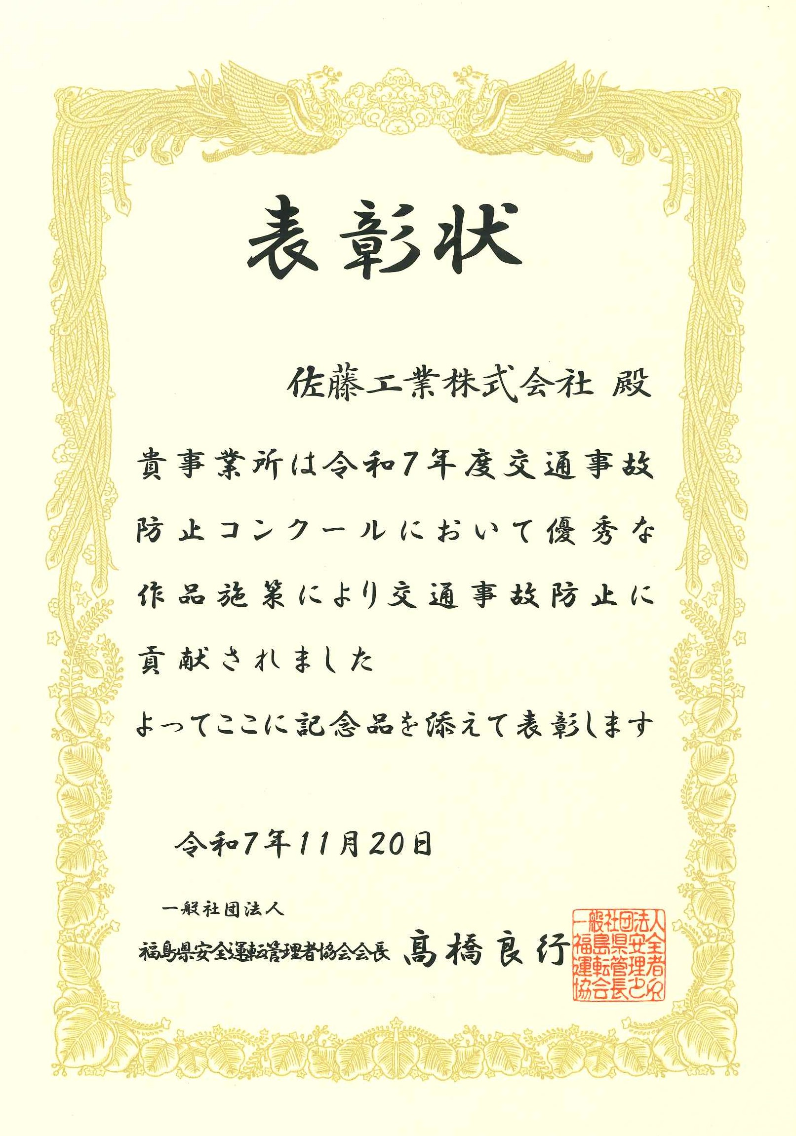 令和7年11月20日付で一般社団法人福島県安全運転管理者協会会長より令和7年度交通事故防止コンクールにおいて表彰状を頂きました。