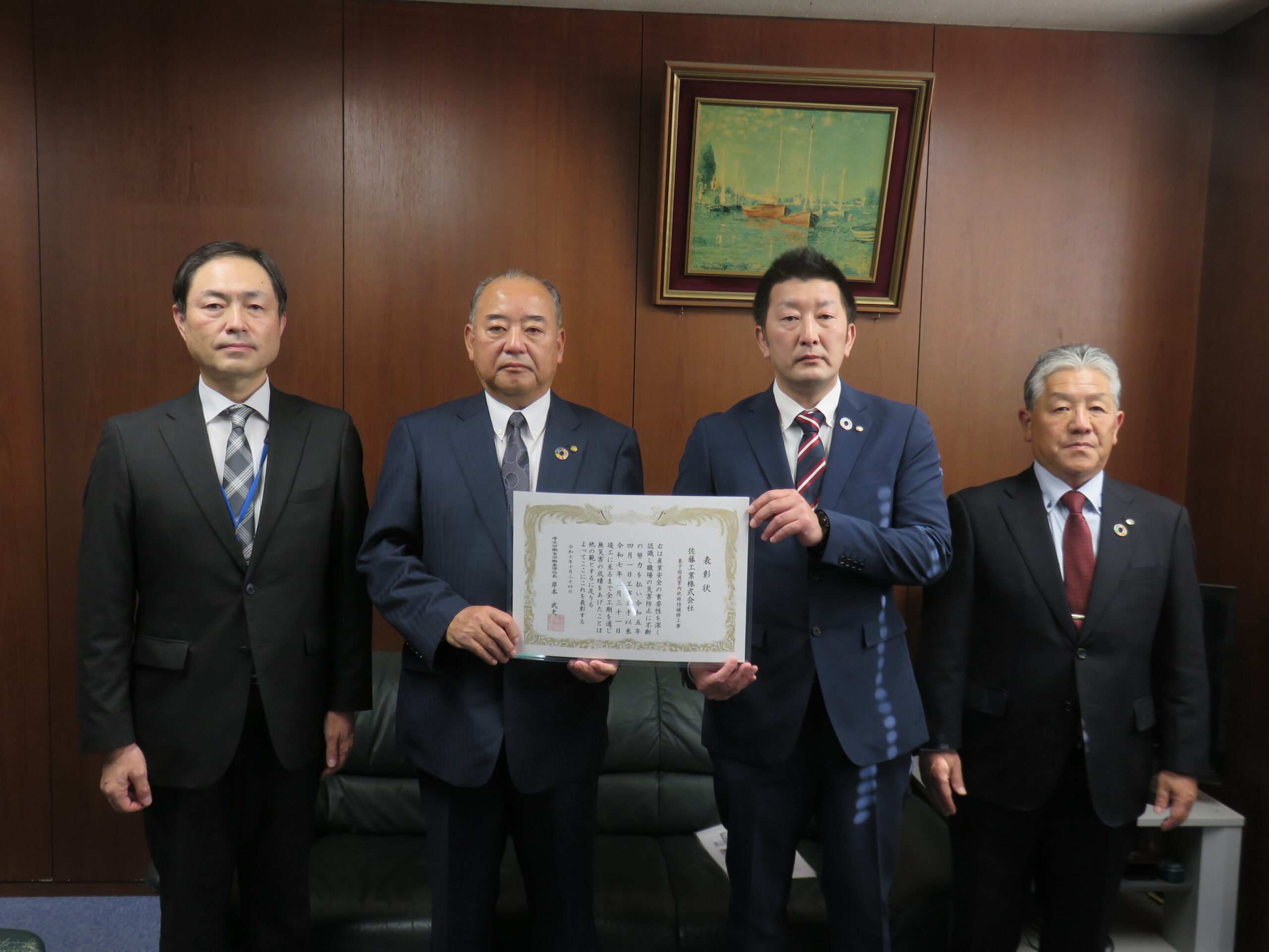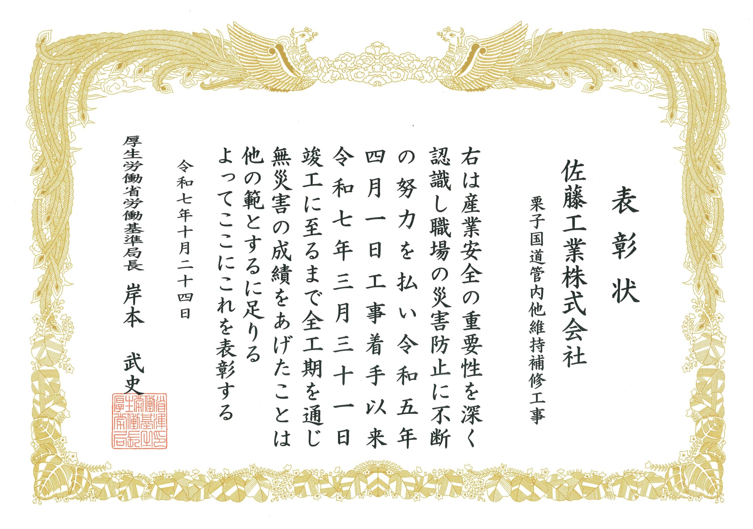 厚労省労働基準局長無災害表彰を受賞しました(栗子国道管内他維持補修工事)