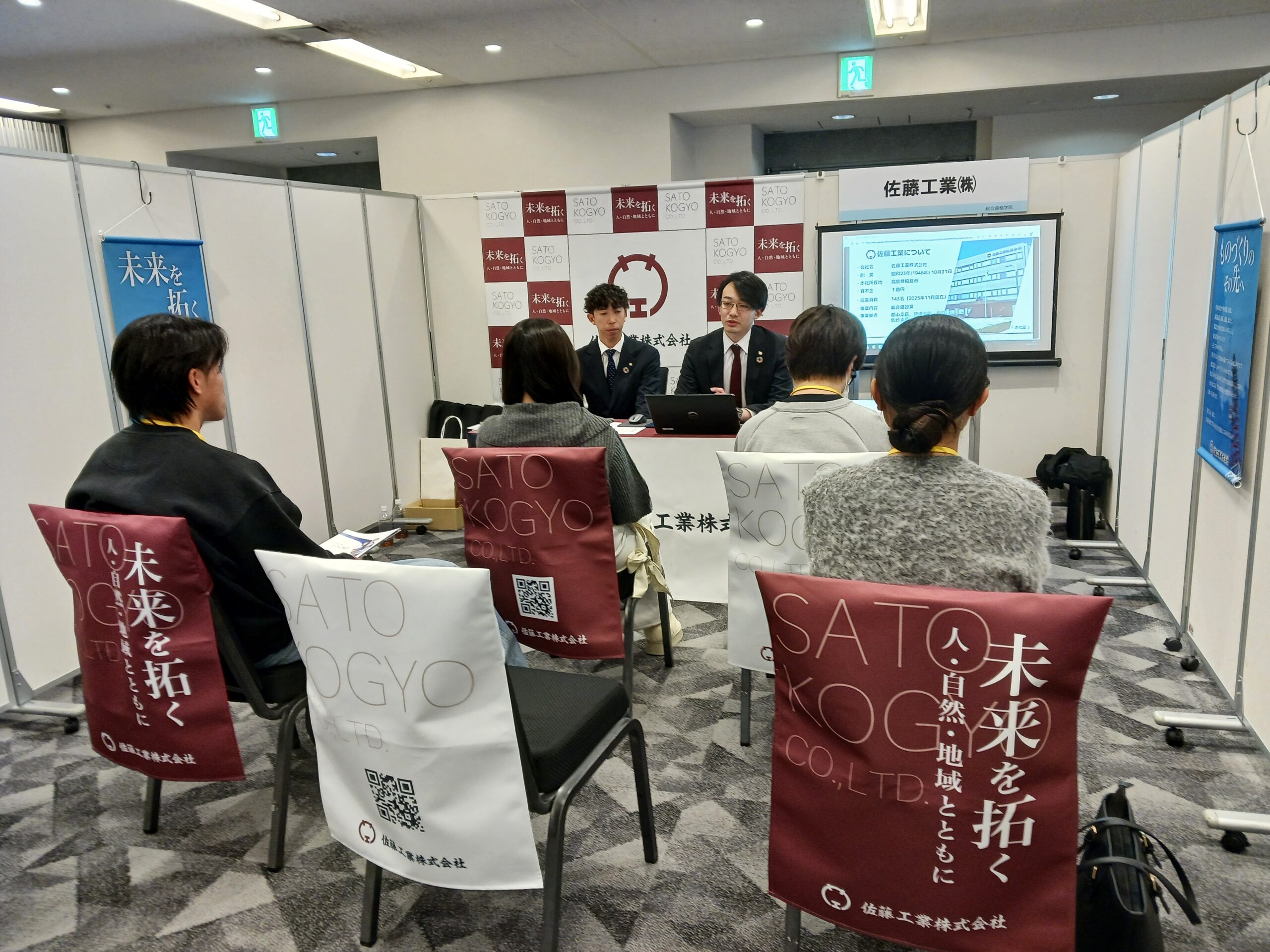 当社ブースにも多くの学生さんに訪問していただき、当社の概要や建築部門について、また、佐藤工業ならではの魅力について発信させていただきました。