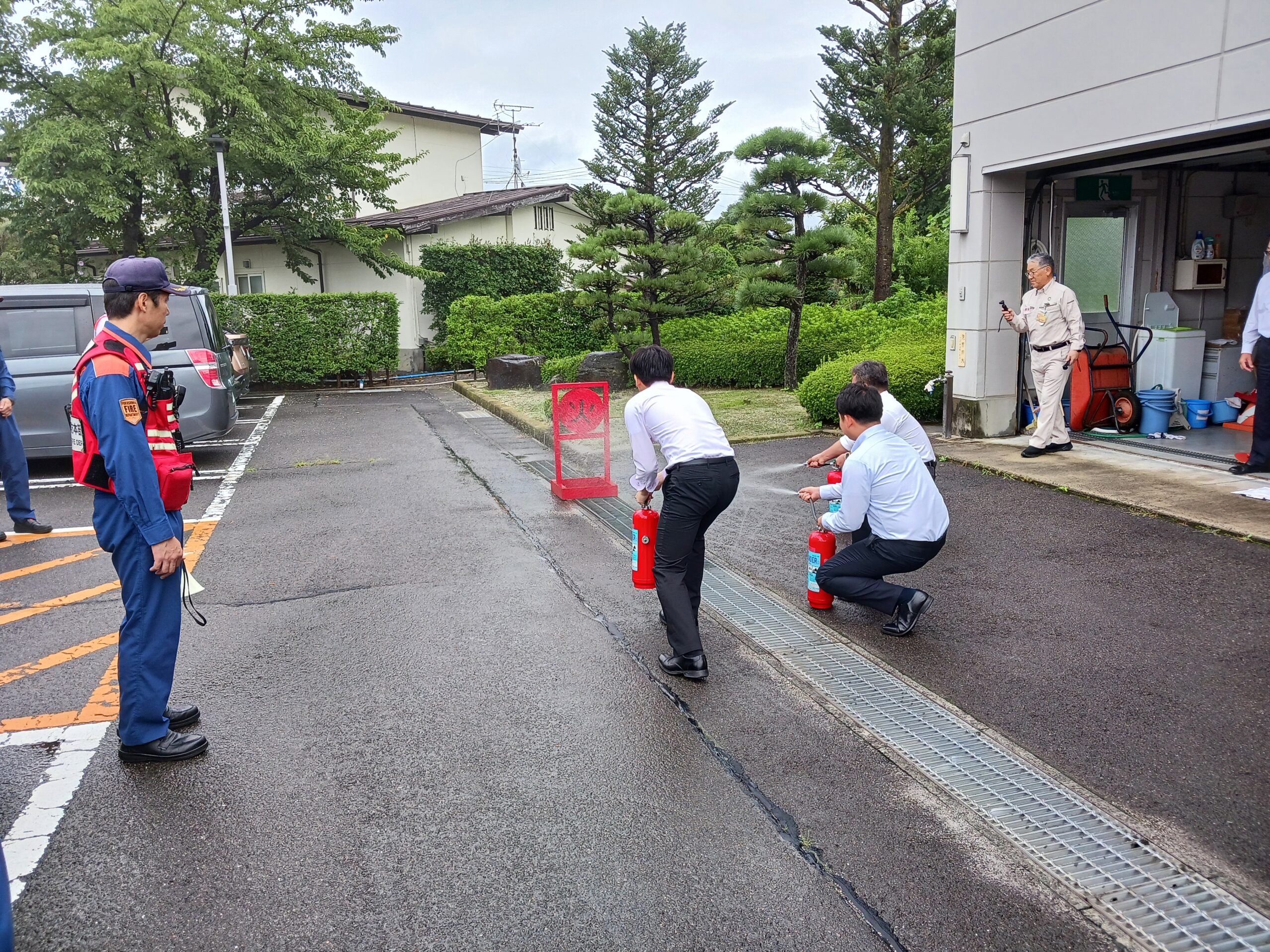 消火訓練では複数の社員が訓練用消火器を用いて、使用方法を学びました。