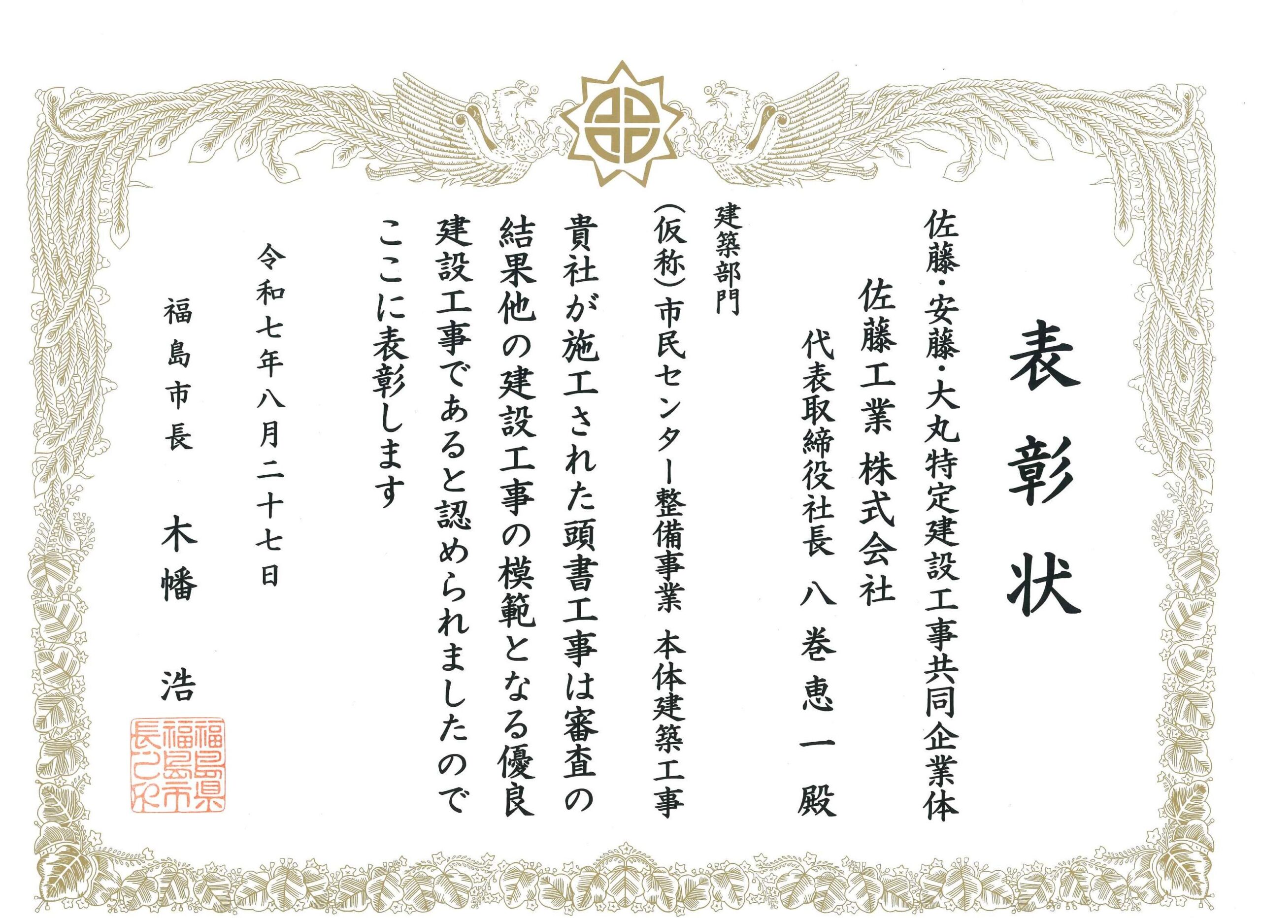 福島市より表彰状を頂きました((仮称)市民センター整備事業 本体建築工事)