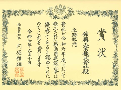 2025年9月10日に福島県知事より、令和7年度福島県優良建設工事表彰(水路部門)にて防災ダム0601工事 大笹生3期地区が受賞しました。 <工 期> 2024年8月~2025年3月 <工事概要> ・維持修繕工事(